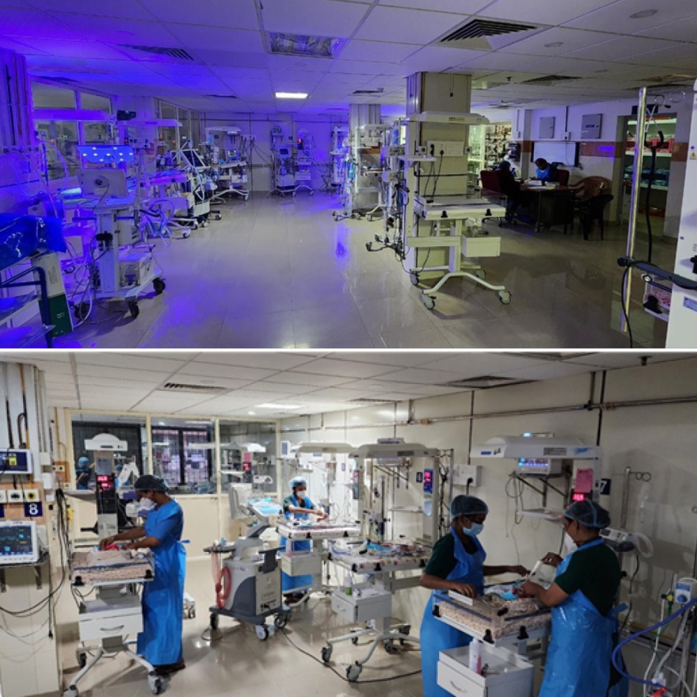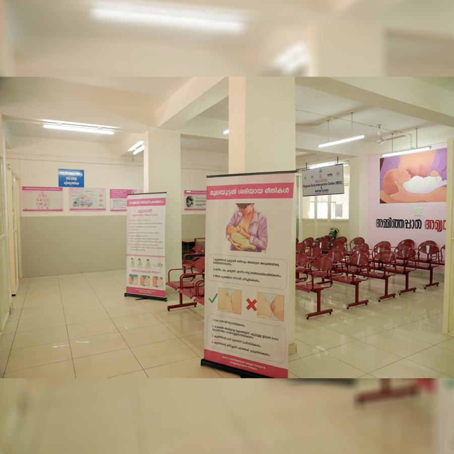 A new neonatal ICU in 3000 sq. feet area was developed in GMC, Thrissur with the financial assistance from National Health Mission (NHM) along with local funds, and started functioning from April 2019. Currently, our neonatology unit is a 56-bedded ICU, with advanced Level III care facilities such as conventional ventilation (13 ventilators), high frequency ventilation, therapeutic hypothermia care, point of care ultrasonography, extreme preterm care, total parenteral nutrition and complex neonatal surgical care.